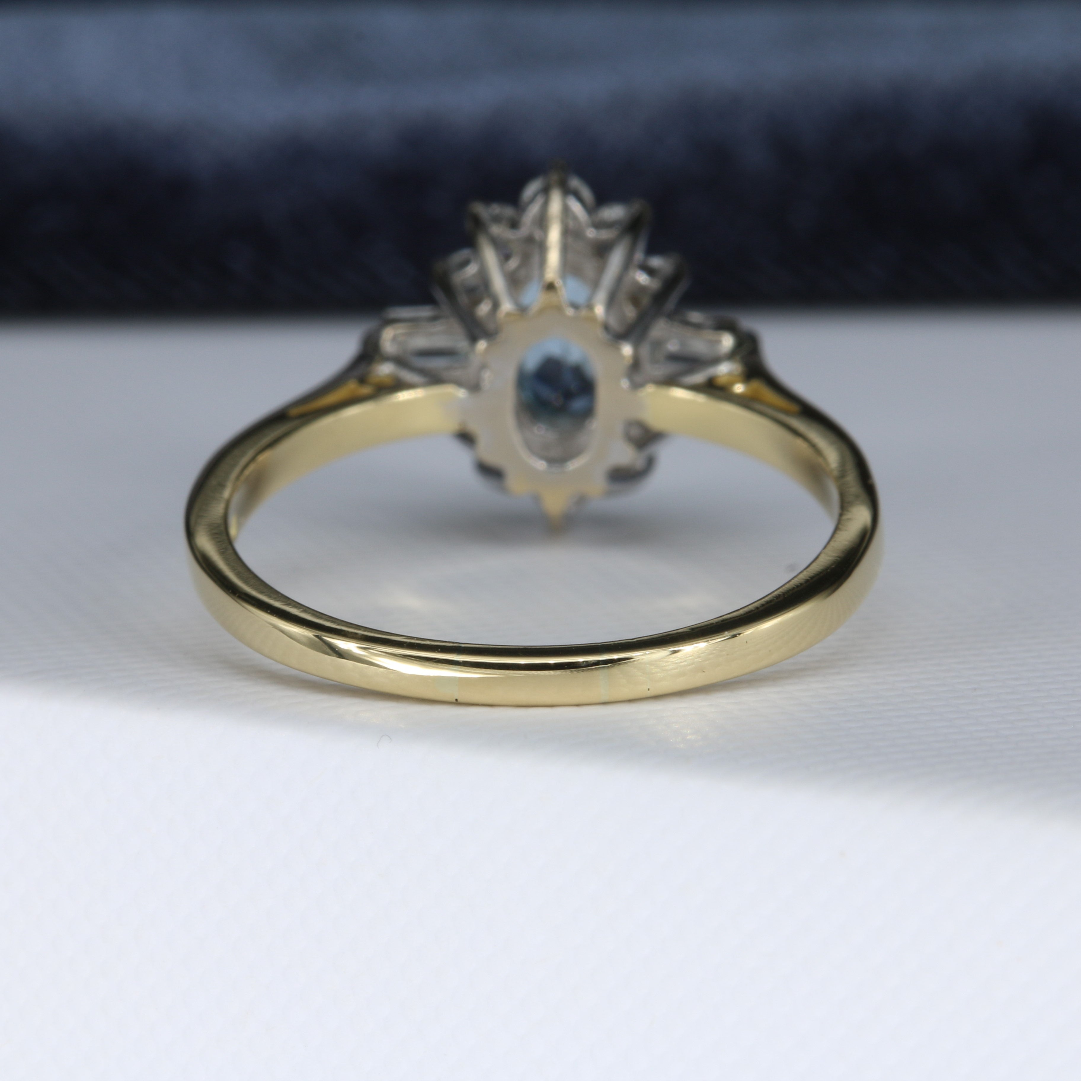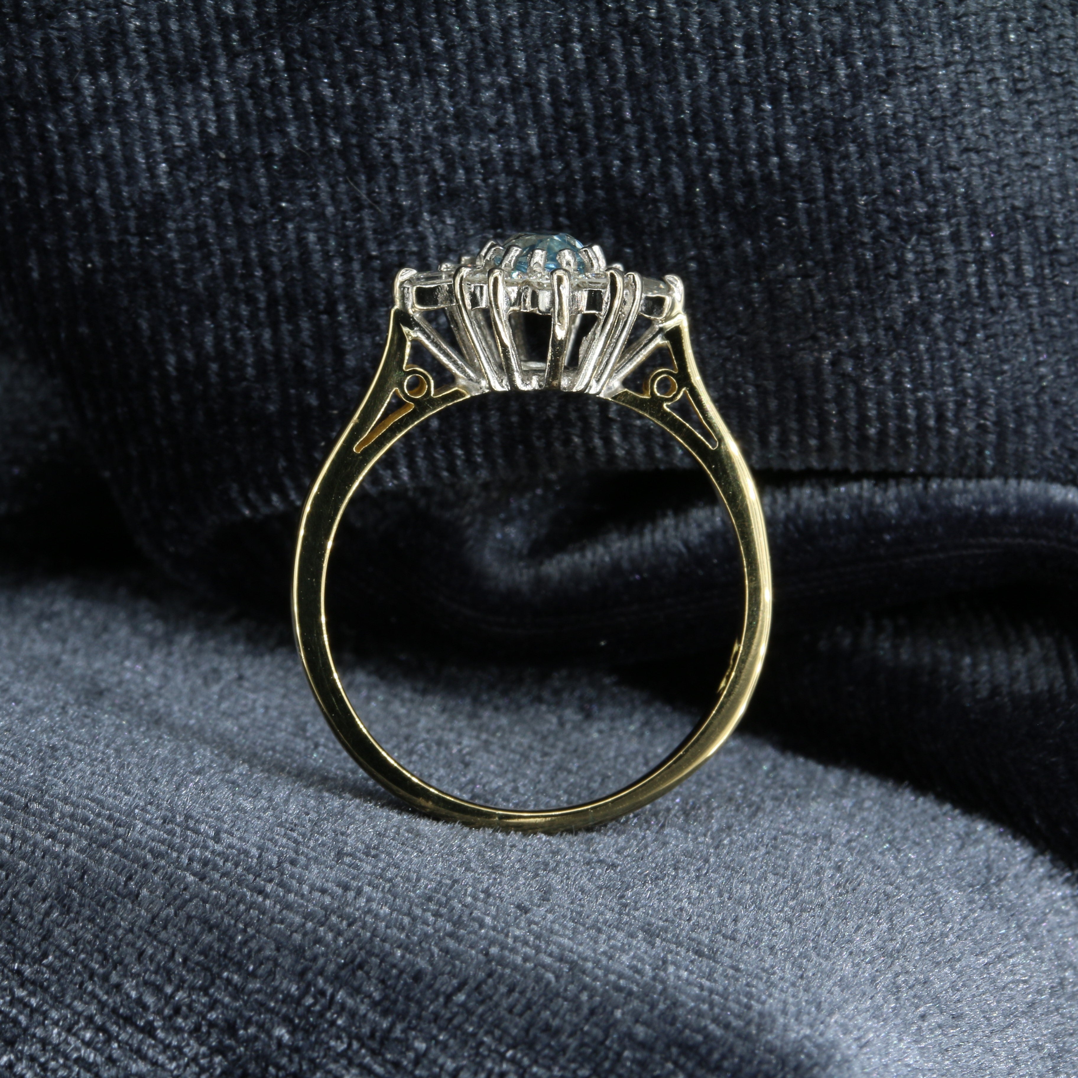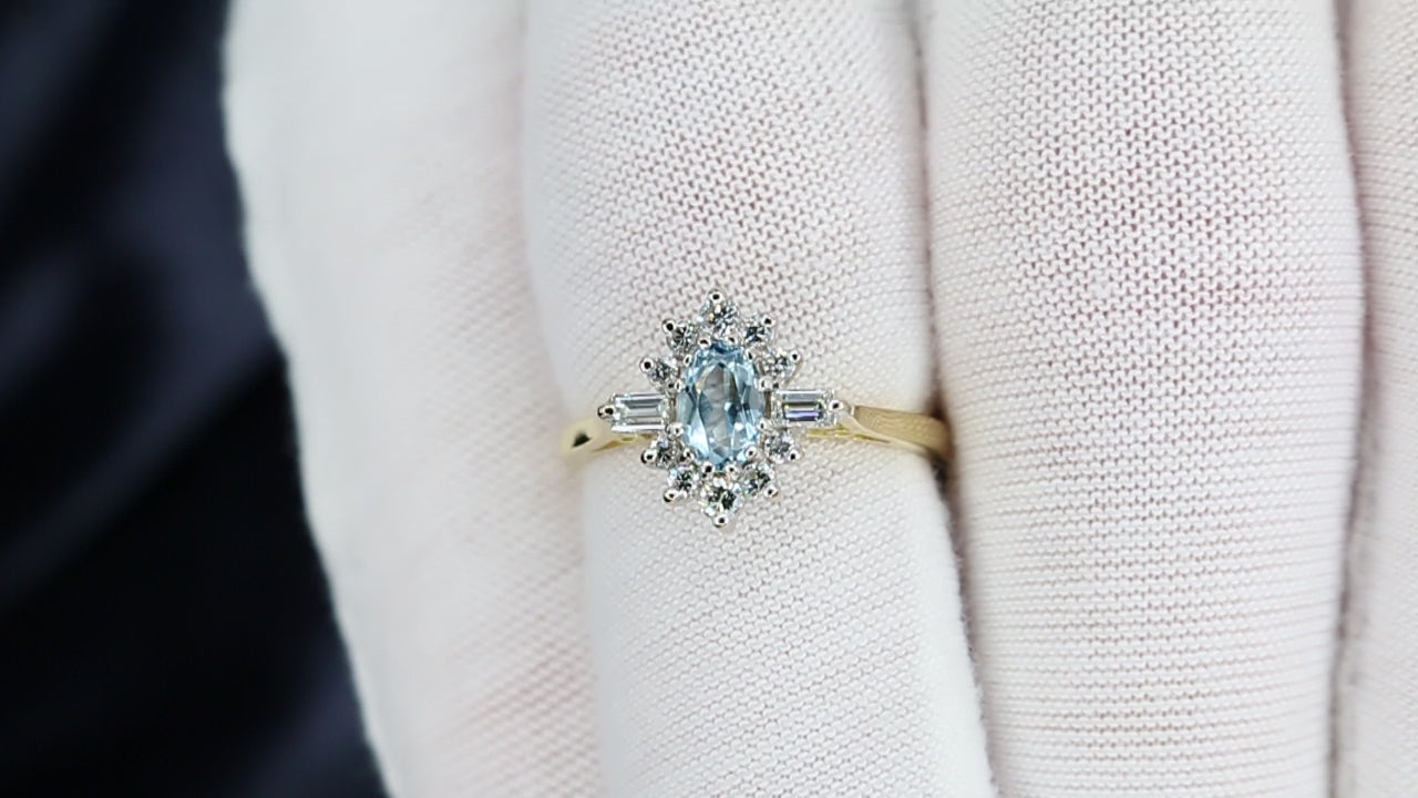 Gabrielle is a beautiful aquamarine and diamond ring set in luxurious 18ct yellow and white gold. Her gorgeous blue aquamarine is partnered by two baguette cut diamonds and a halo of ten sparkling round brilliant cut diamonds.