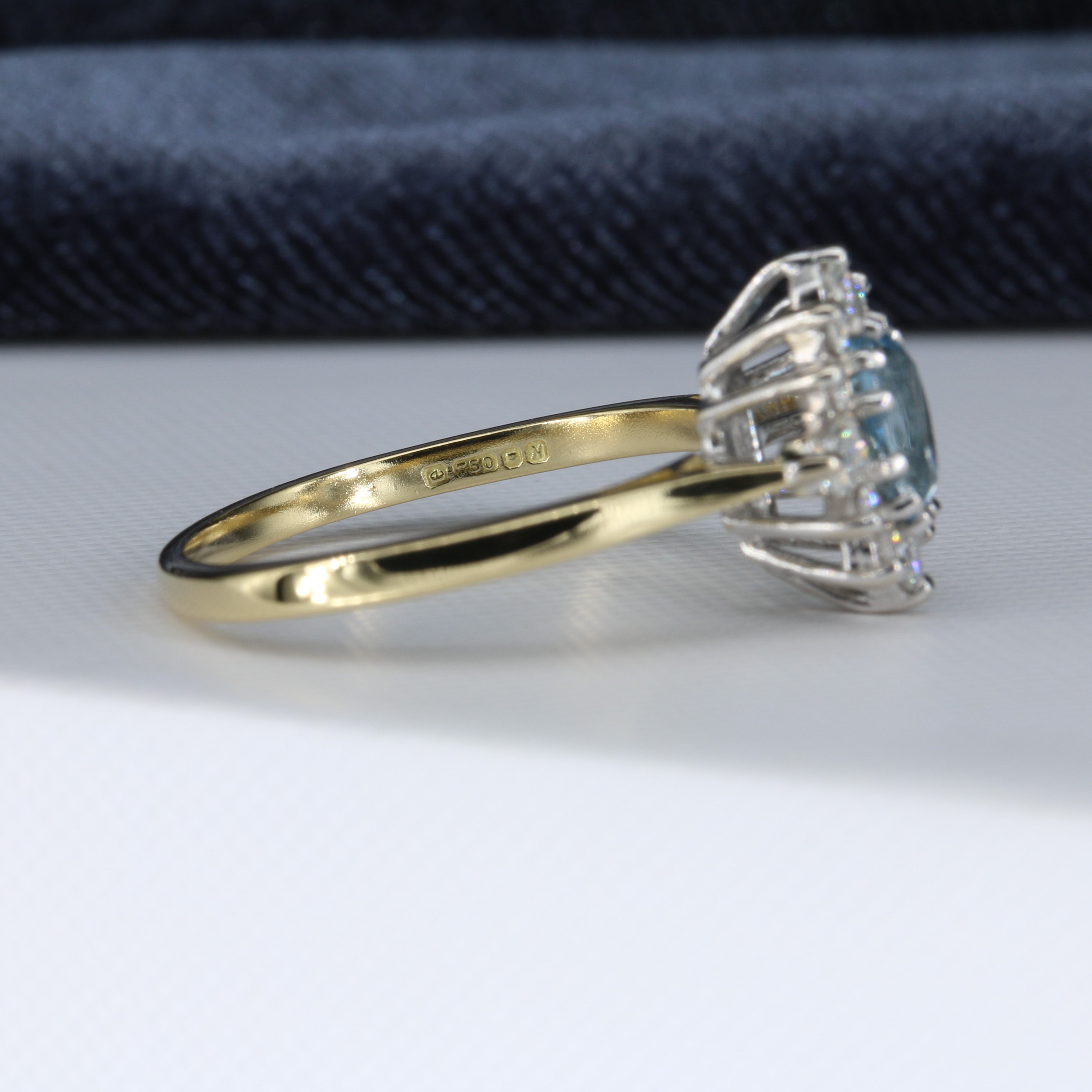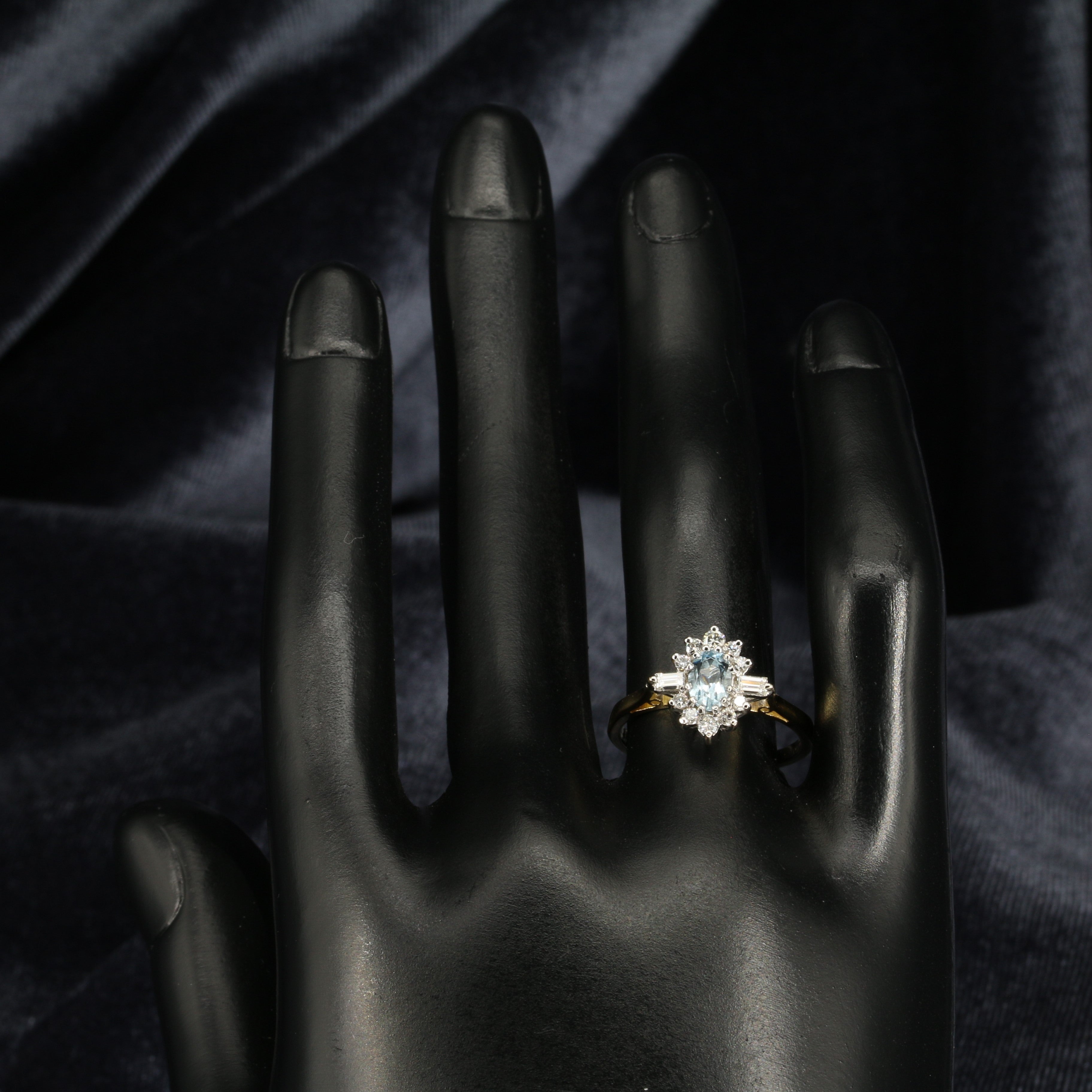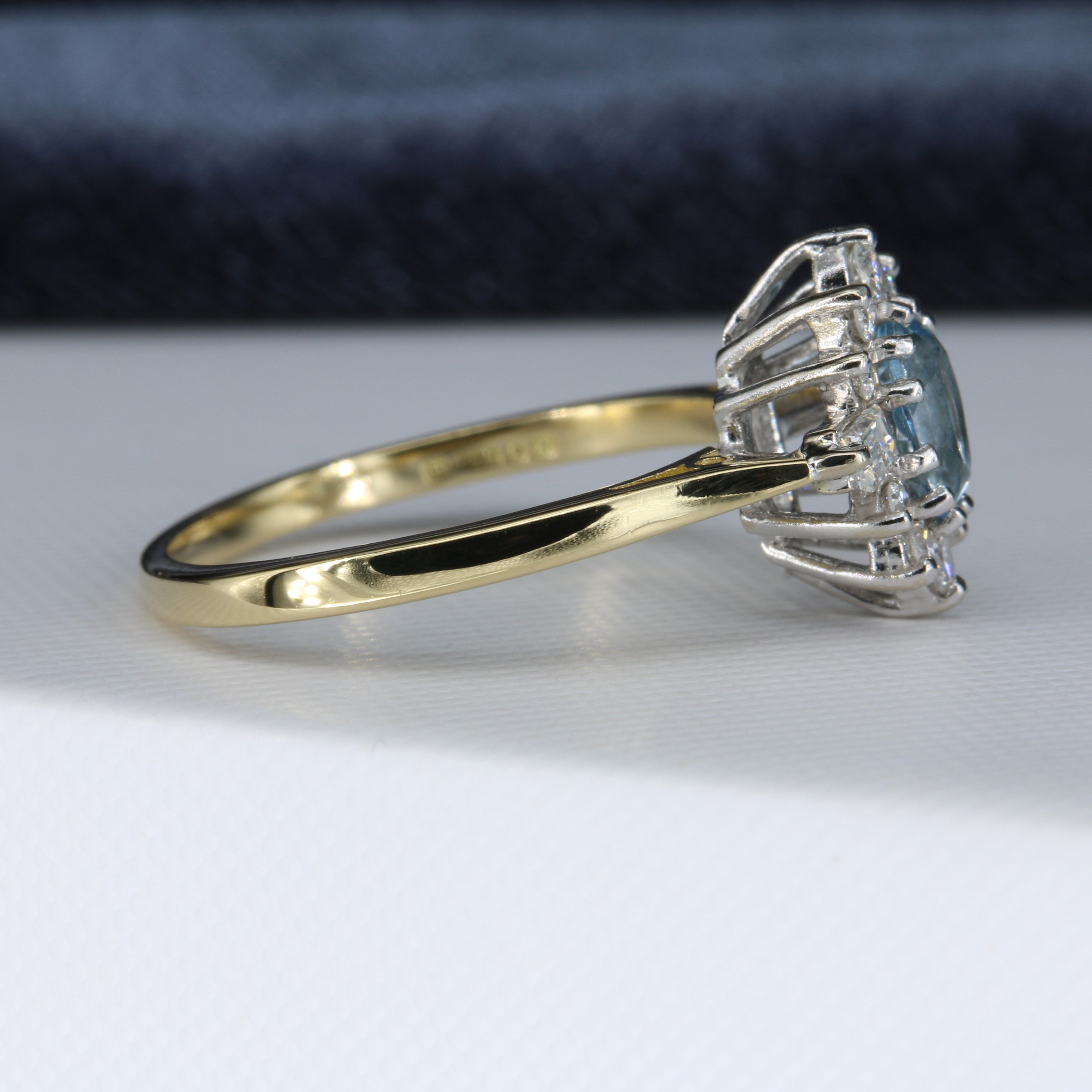 Gabrielle is a beautiful aquamarine and diamond ring set in luxurious 18ct yellow and white gold. Her gorgeous blue aquamarine is partnered by two baguette cut diamonds and a halo of ten sparkling round brilliant cut diamonds.