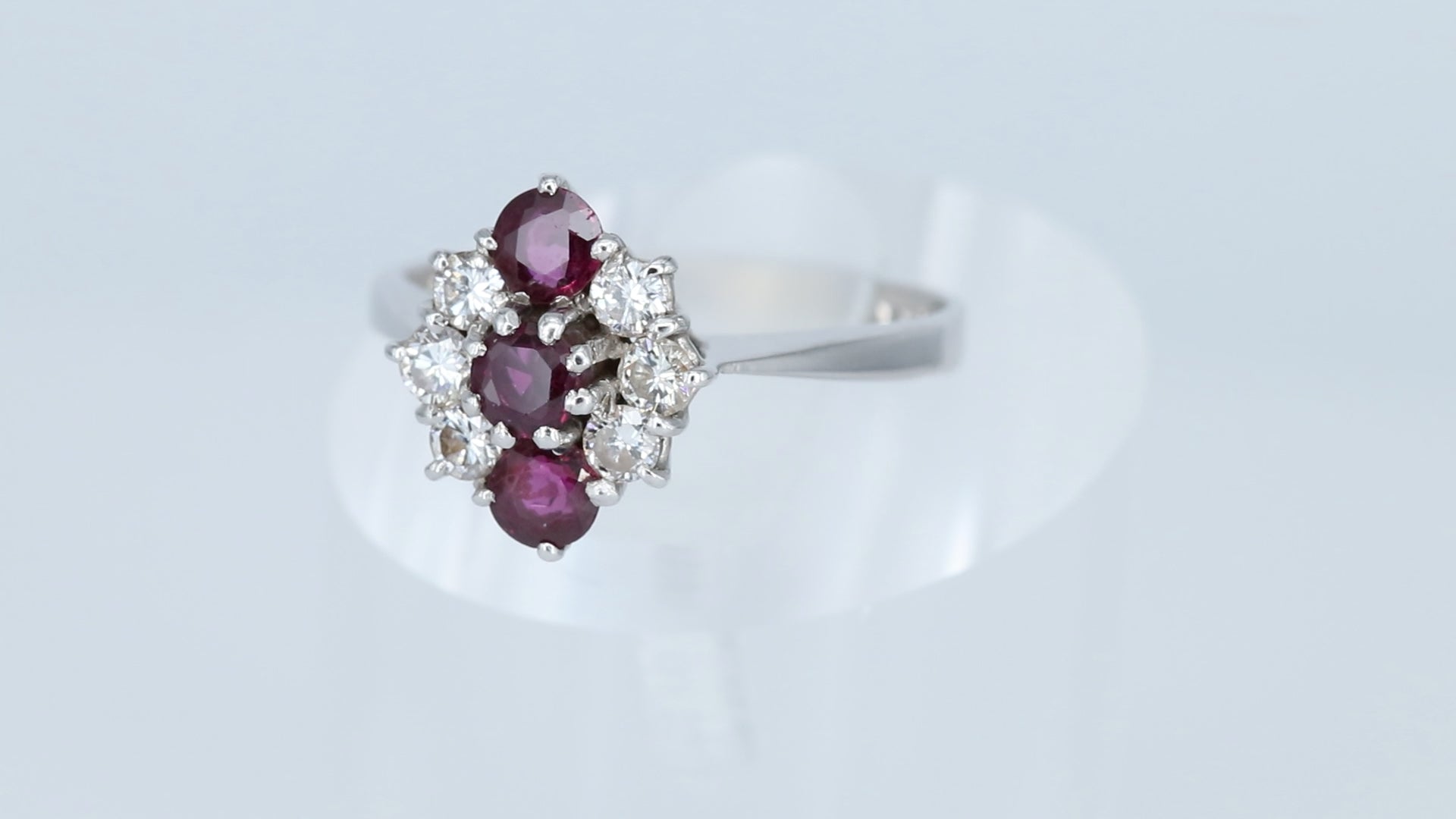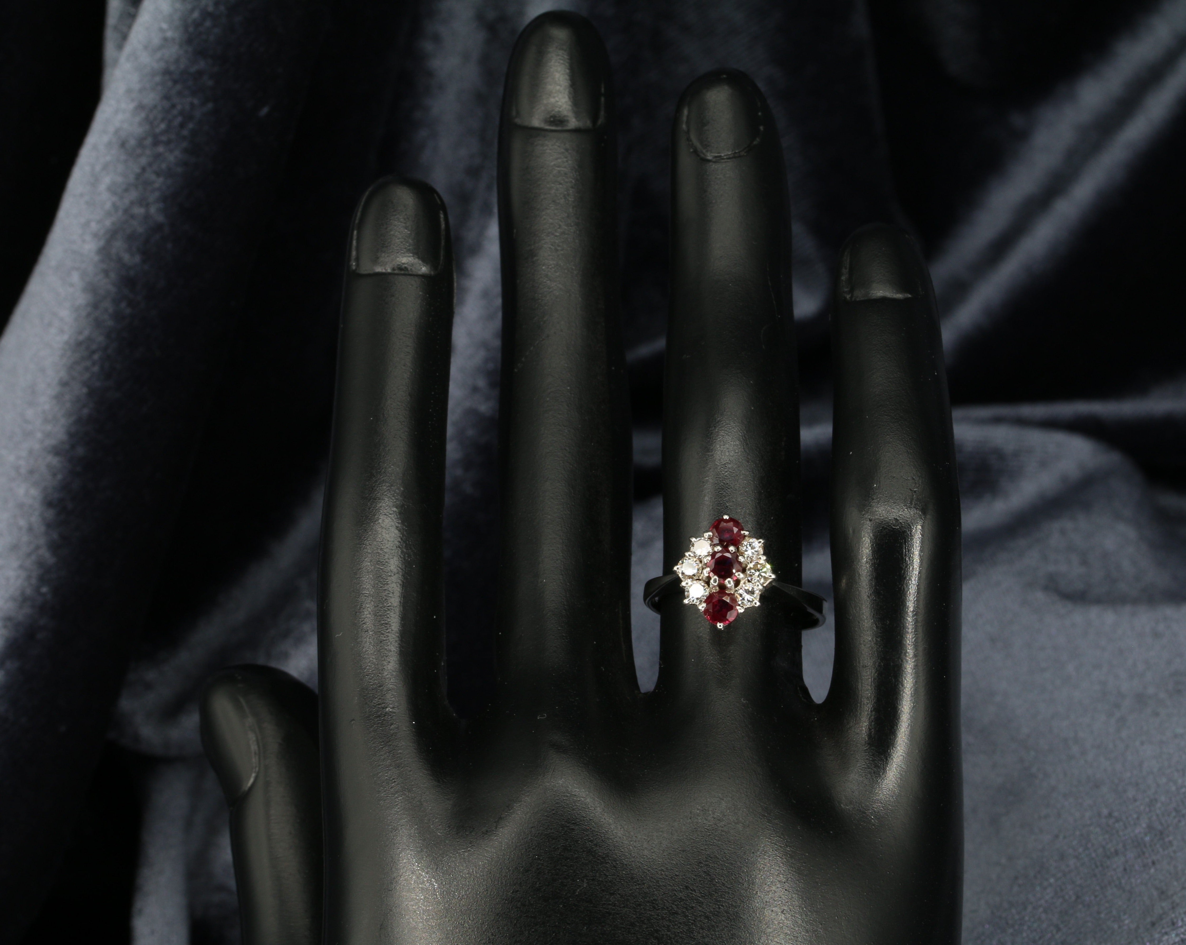 George from Whitehawkes says “Beautiful red rubies and diamonds a fabulous combination! I love the design of this ring which is very stylish with the round rubies set in between six diamonds creating a diamond shape. The rubies have beautiful dark red colour tone and the diamonds are of good colour and clarity. Superb quality set in 18ct white gold and in excellent condition following checks and an expert ultrasonic clean and polish by the Whitehawkes goldsmiths.”