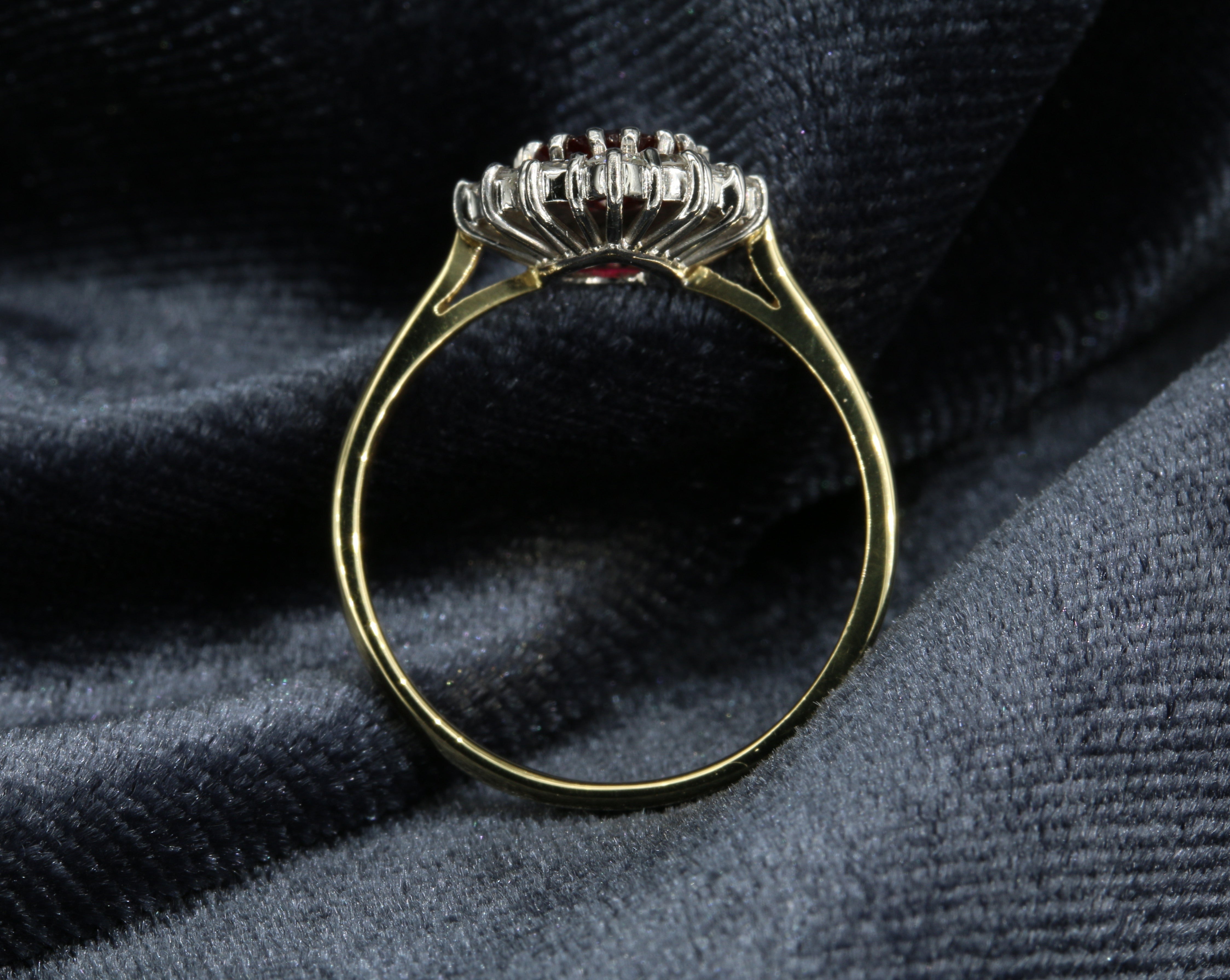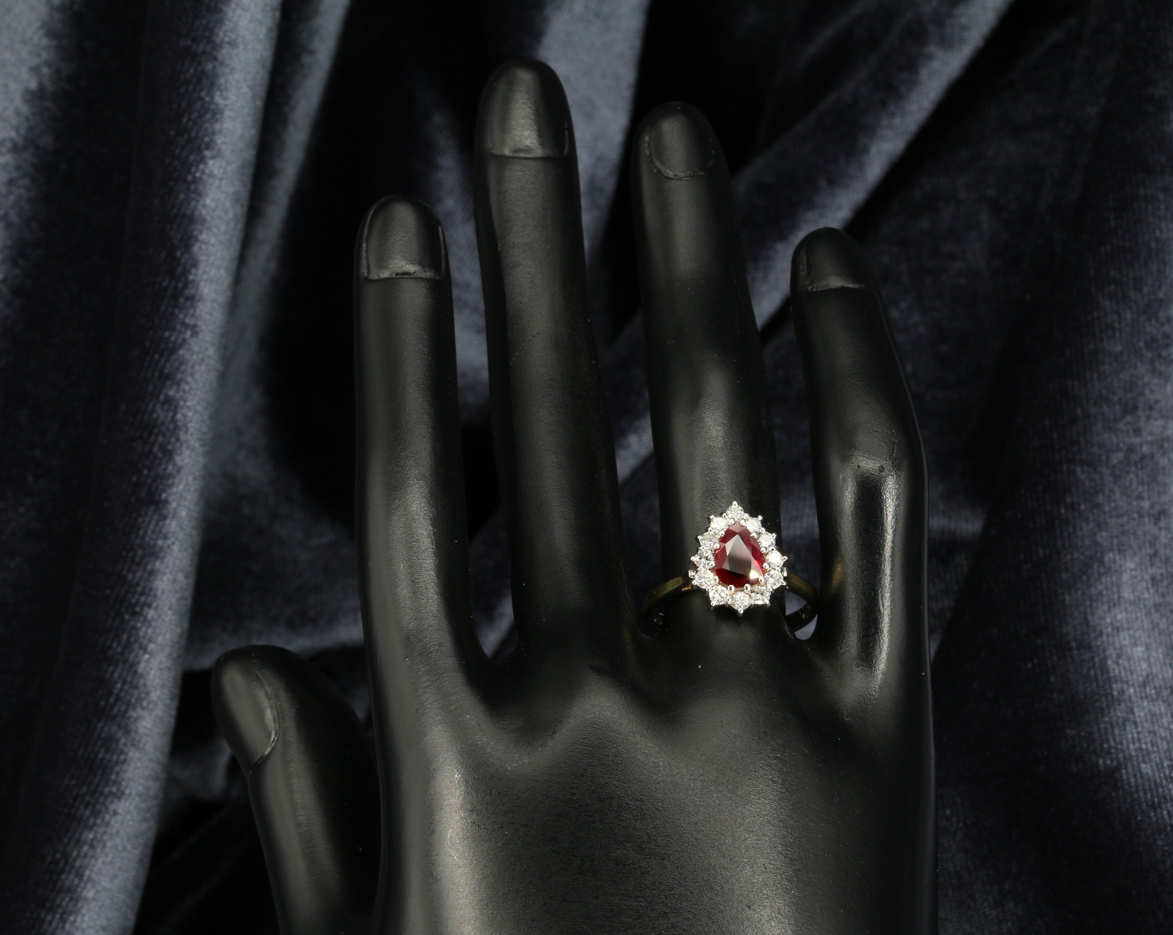 Rhiannon is our gorgeous pear cut ruby and diamond cluster ring set in luxurious 18ct yellow and white gold. Her beautiful pear cut red ruby is partnered by a halo of sparkling diamonds.