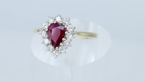 18ct Gold Ruby & Diamond Ring 1.00ct Pear Cut Size UK O US 7.25 EUR 55