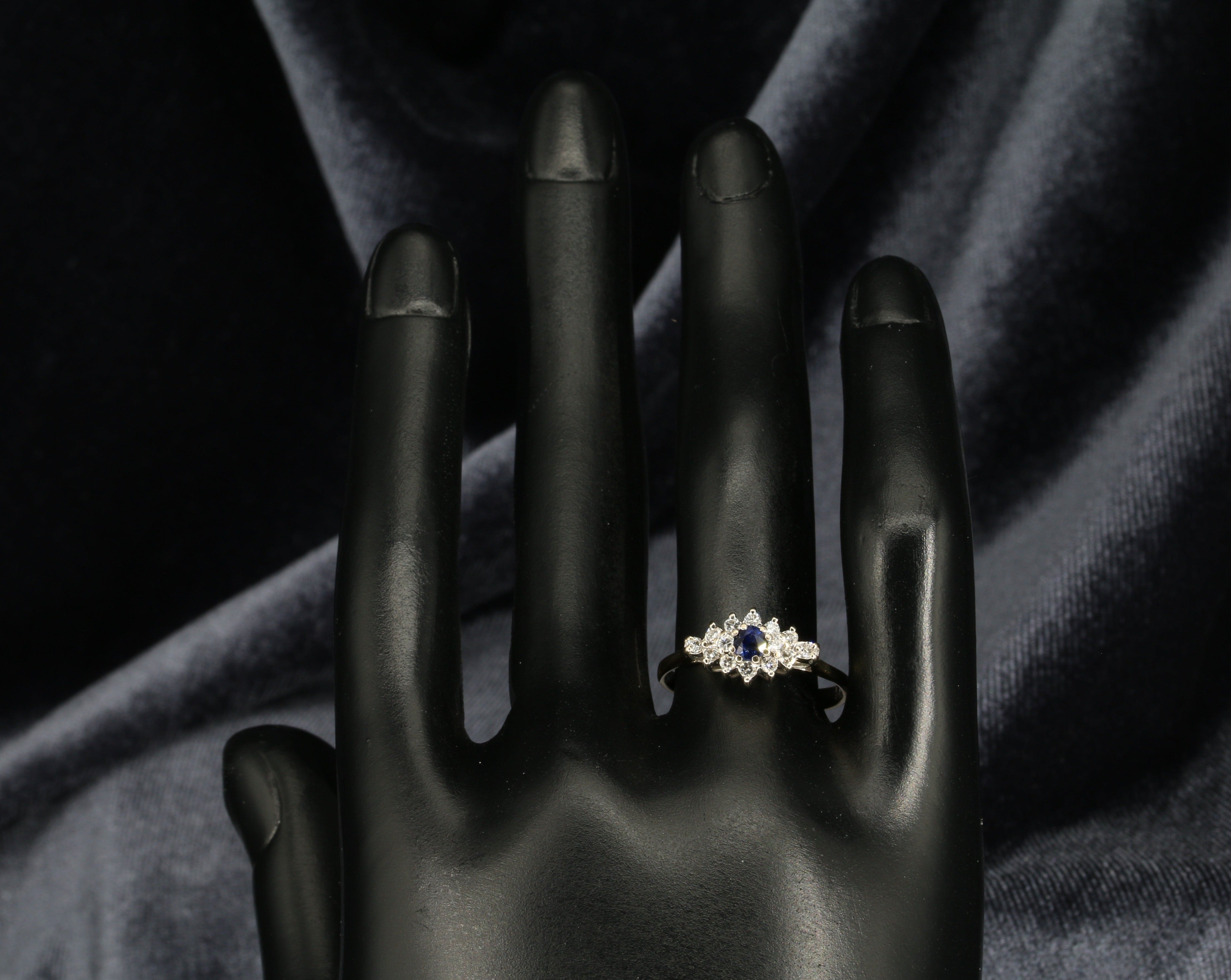 George at Whitehawkes says "A gorgeous ring! A very beautiful bright blue sapphire partnered with fourteen sparkling round brilliant cut diamonds in a kite shape. I love the quality of construction and timeless style this ring has. This would make a fabulous alternative engagement ring or gift for another special occasion. In superb condition following an ultrasonic clean and expertly polished by the Whitehawkes goldsmiths."