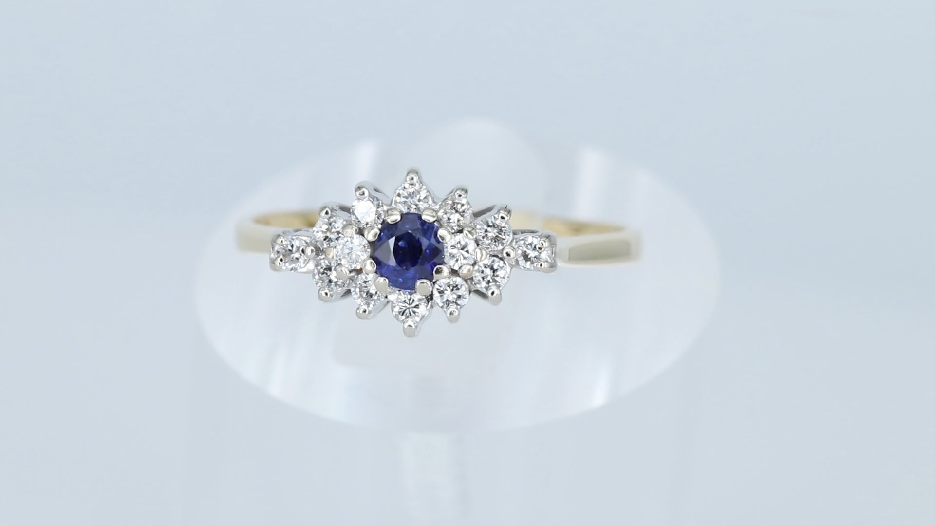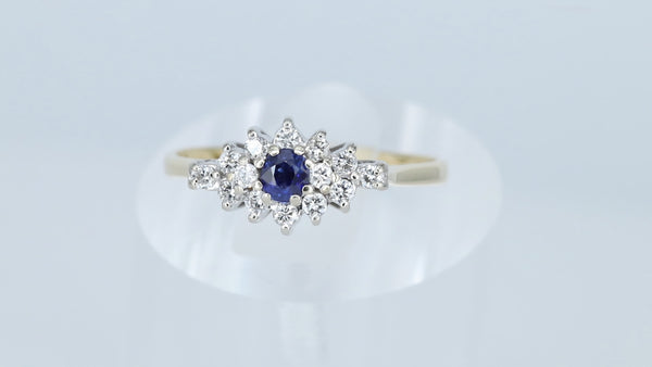 Paula is a gorgeous 18ct yellow gold round sapphire and diamond cluster ring. Her beautiful round cut blue sapphire takes centre stage and is surrounded by fourteen sparkling diamonds. Her 18ct yellow gold band is elegantly tapered up to her 18ct white gold setting.