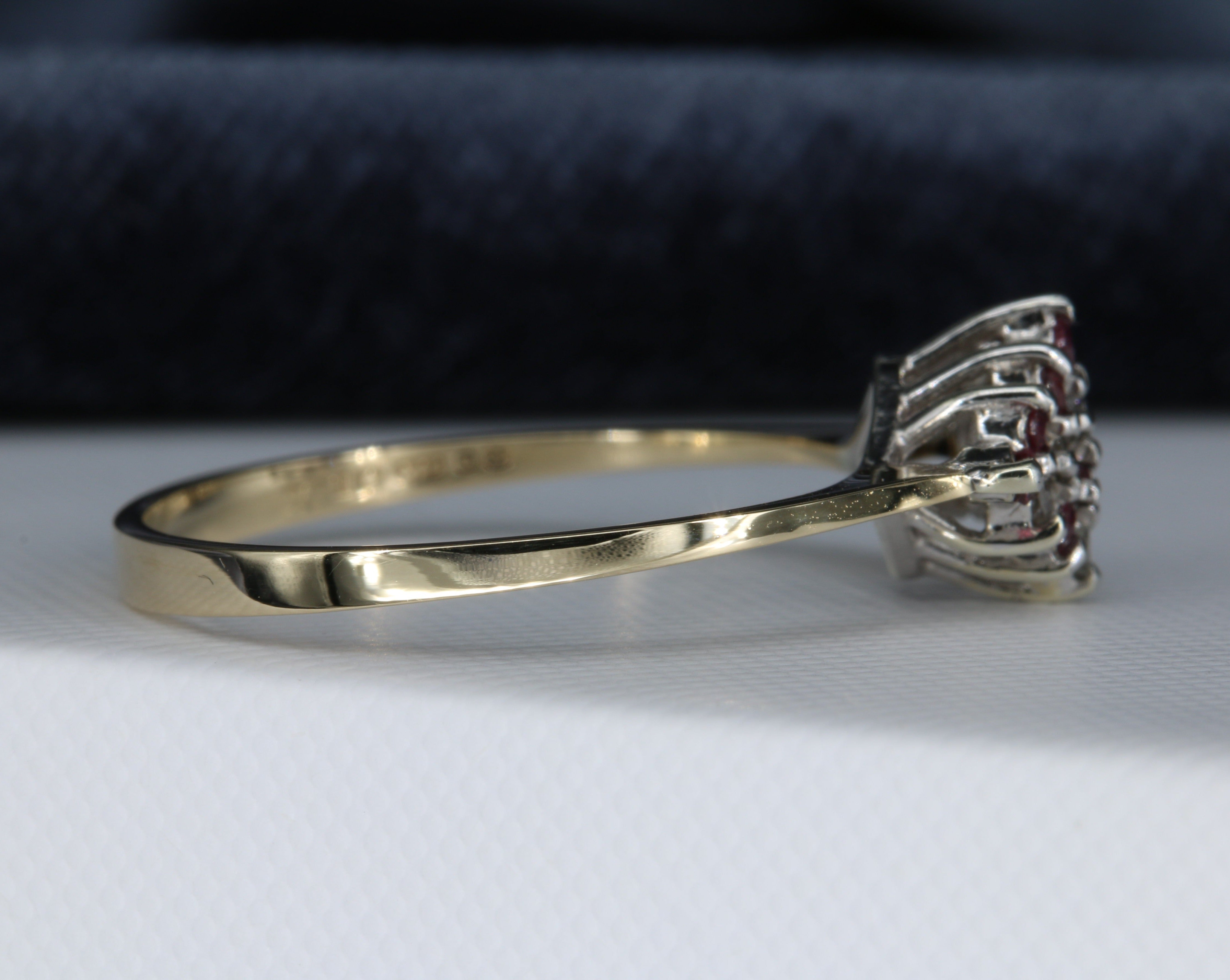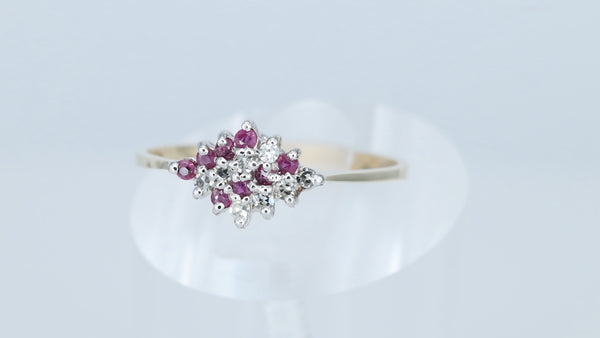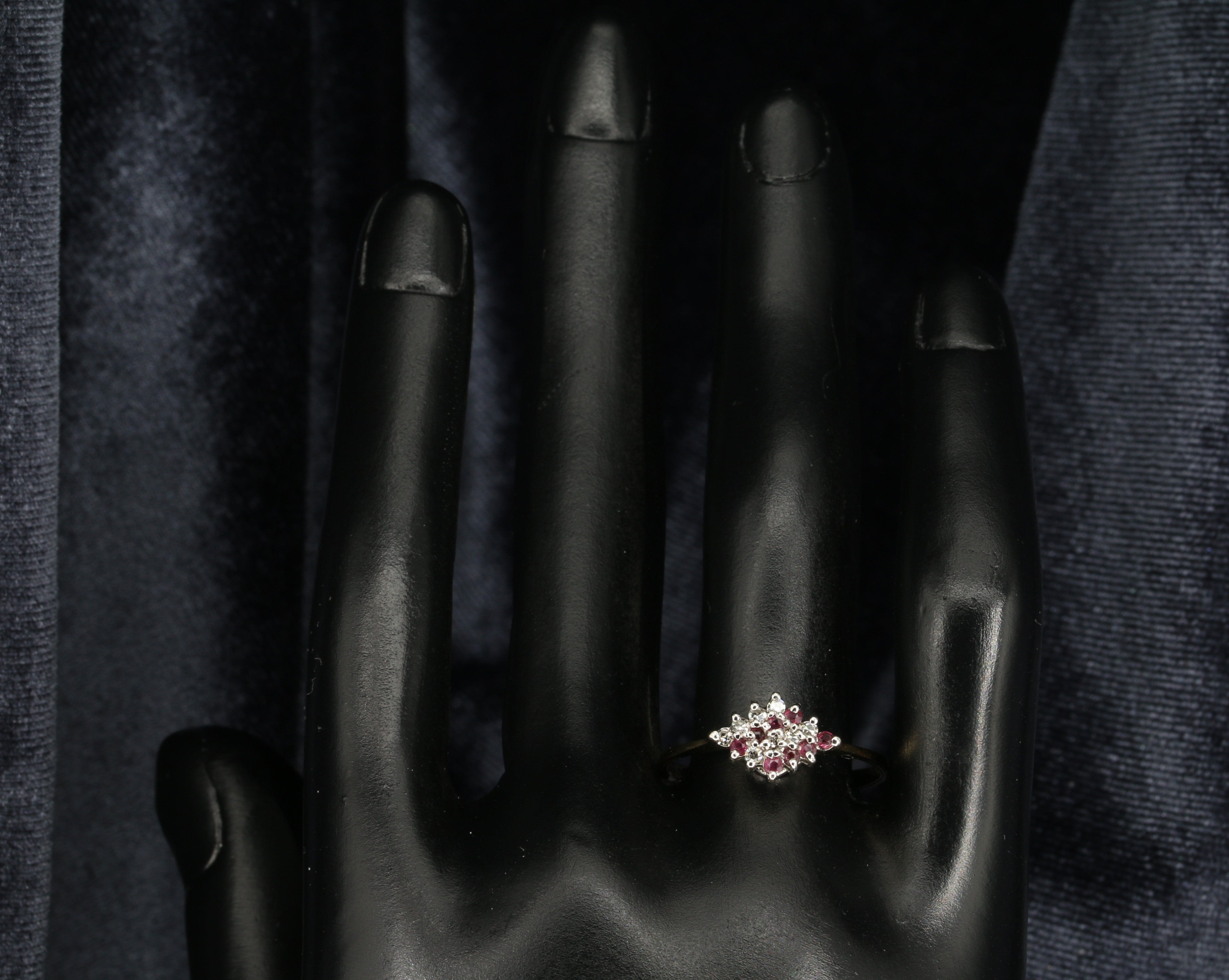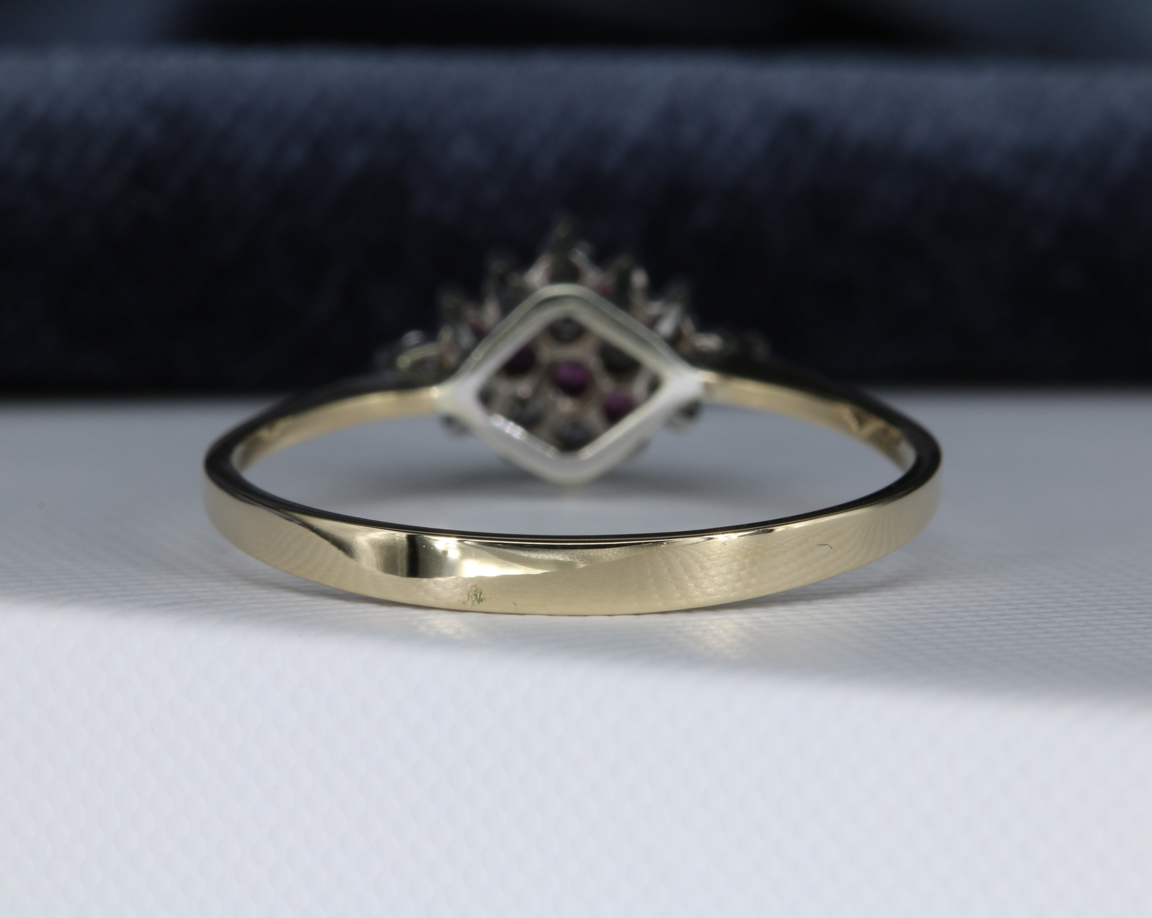 Zoe is a stunning ruby and diamond ring featuring rich red rubies partnered with sparkling diamonds. A very beautiful design set in 9ct gold in a diamond shaped cluster style.
